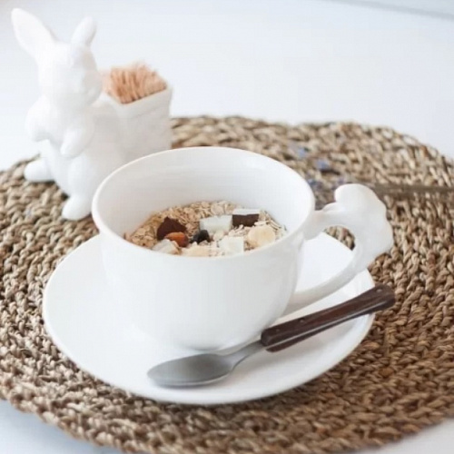 Очаровательная пара! Чашка с милым крольчонком создаст игривое настроение за завтраком, блюдечко может стать хранителем десерта. А еще в чашке можно заварить овсянку на кокосовом молоке, а на блюдечко выложить бабушкины пирожки. Экспериментируйте!